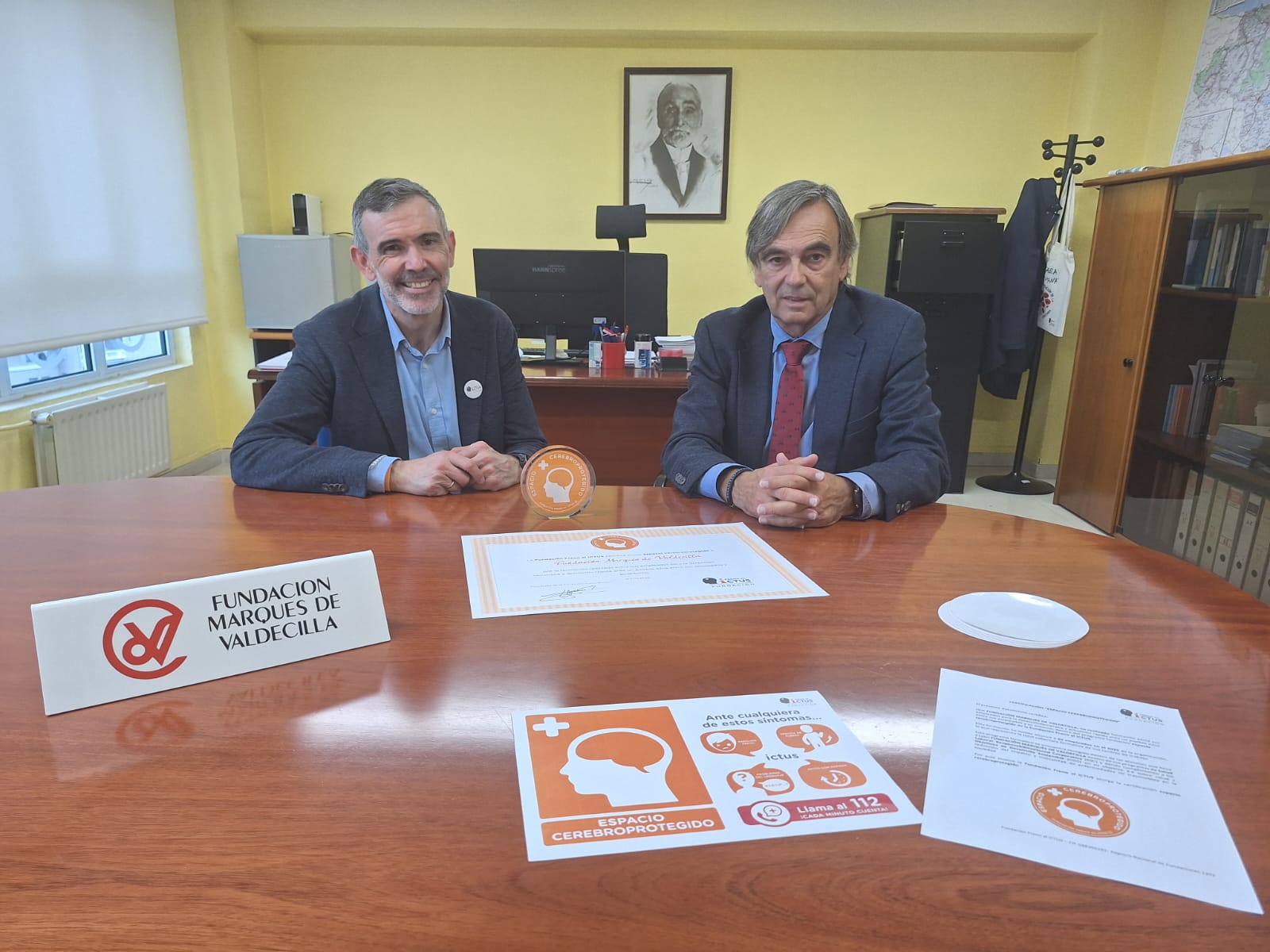 El gerente de la Fundación Marqués de Valdecilla (FMV), José Francisco Díaz, ha recibido oficialmente la certificación ‘Espacio Cerebroprotegido’ de la mano del presidente de la Fundación Freno al Ictus, Julio Agredano, tras la formación que han recibido los trabajadores de la FMV con el objetivo de identificar de forma precoz las señales de un ictus para actuar con rapidez y aumentar las posibilidades de supervivencia.